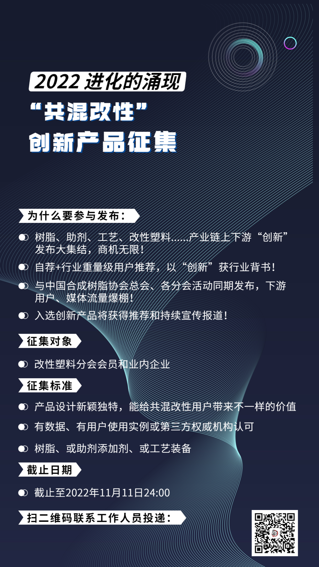 如果你觉得你的产品足够创新,足够新颖,能给共混改性用户带来不一样的价值,你可以报名产品征集,我们期待在发布会上展示你的产品: